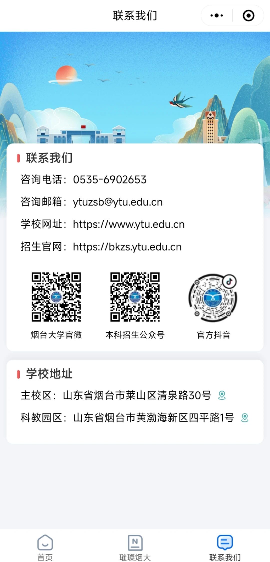 轻触海平面,启阅烟大新章。在黄海之滨,书声与浪花共舞,千米沙滩烙印青春足迹。承开放包容之魂,融山海博大胸怀。探浪花淬炼的知识海岸,燃向深蓝的未来航程。这里,海风托举梦想,每一次潮涌都是思想的交响。指尖轻启,与山海同窗,共赴星辰大海——你的未来,从此海阔天空!